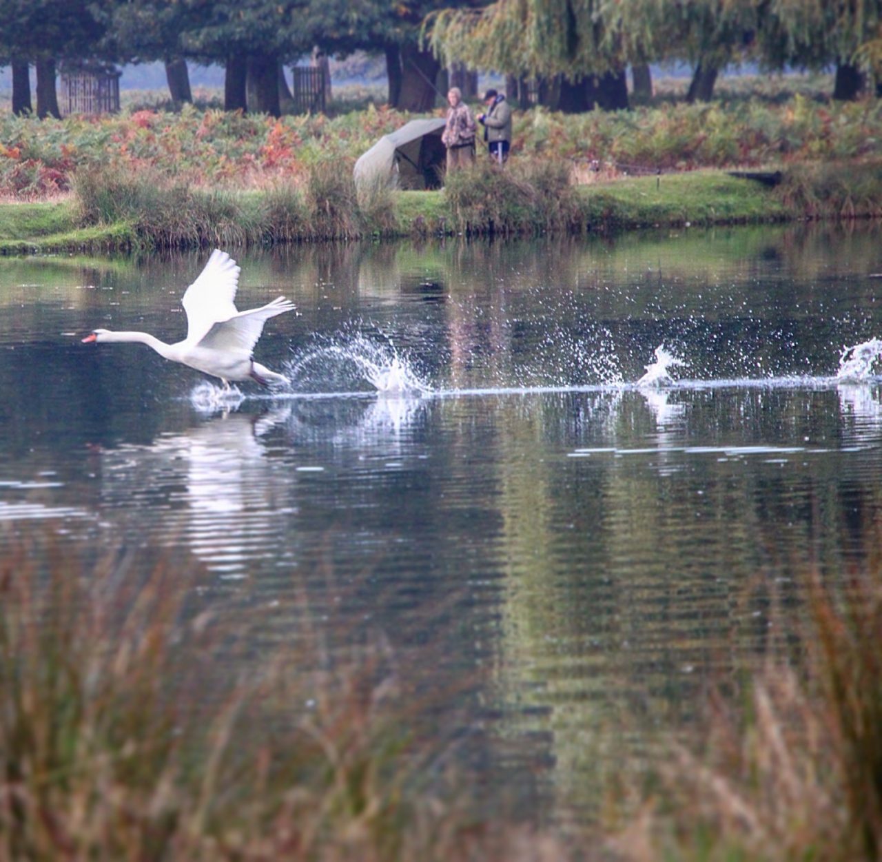 After a few minutes we moved on and discovered the beautiful Heron Pond, which is connected to the equally beautiful Leg of Mutton Pond by a narrow waterway. There were waterfowl of all shapes and sizes going about their business, whilst fisherman quietly looked on, dogs sniffed invisible ‘sniffs’, and cyclists and walkers passed by. All of this going on to the soundtrack of stags bellowing as they wandered through the head-high bracken with just their antlers and their voices giving their presence away….marvellous!
