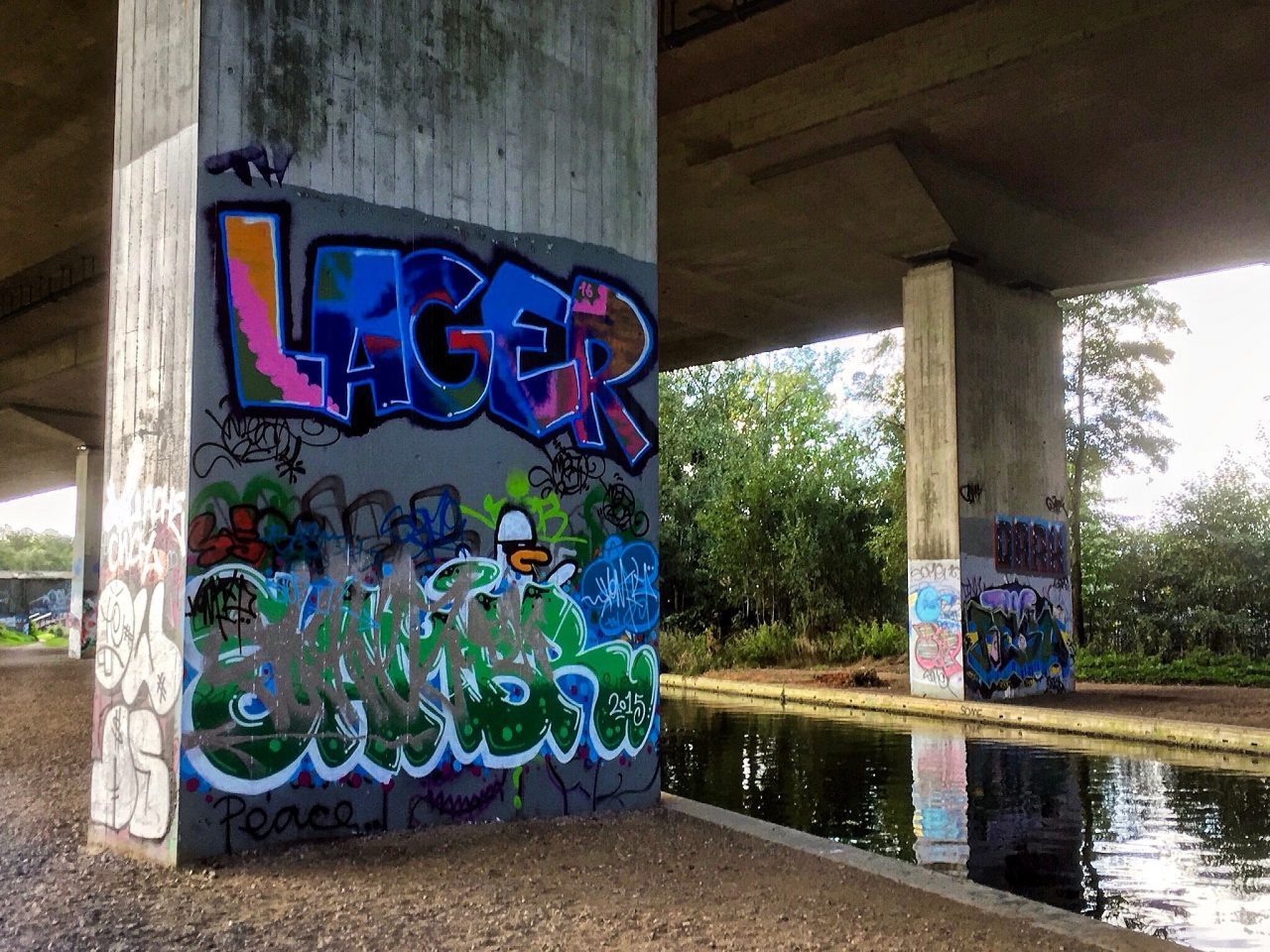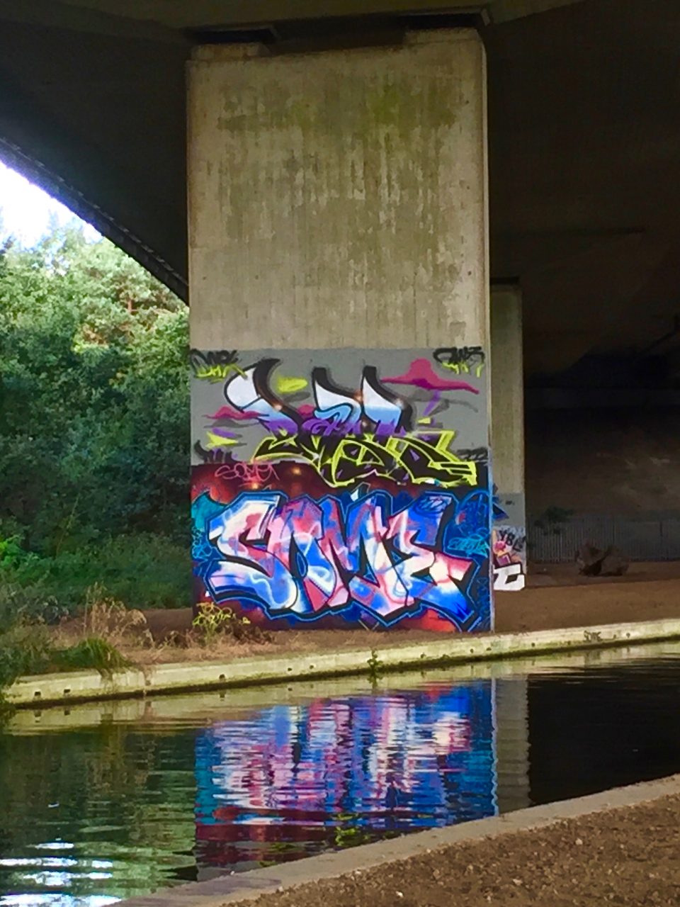 is very green: our walk took us past the bottom of lots of private gardens, some of which had put gates into their back fences to allow quick access to the tow path…lucky things. On the other side of the river was a myriad of house boats in all sorts of sizes and colours. A young boy was having his first fishing lesson from his grandfather, watched contentedly by his parents, and there were a few walkers strolling along with their dogs. It was a lovely scene, made all the nicer when you remember that you are actually right in the thick of it. A reminder of the hub bub behind the greenery were the legs of the M25, which you pass right under. They were decorated with graffiti … and how! I hadn’t seen ‘serious’ amounts of graffiti for years but I don’t remember it being quite so accomplished. It was quite fabulous, and was all the colours of the rainbow … including metallic silver. Shiny silver graffiti…When did that happen?! The work had obviously been done with some skill and I should imagine a huge sense of pride.
