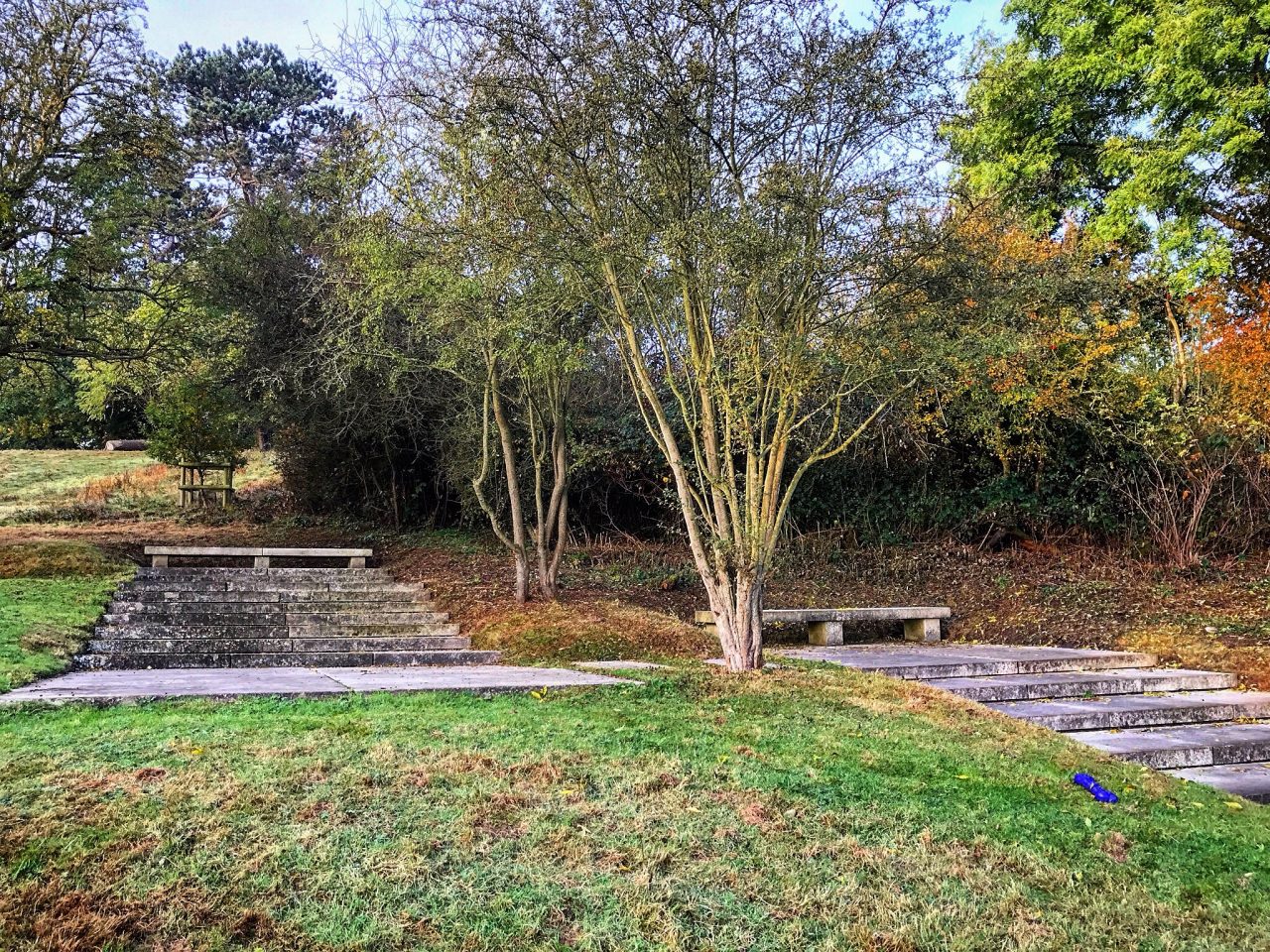 Upon reaching the woods we turned left, passed through the gate and followed the trail downwards. If you follow the main track or path everytime you get an option I think you’ll find the meadows and the other memorials easily. There are a few purple waymarkers along the route too…basically it’s fool proof, and the woods aren’t so big that if you go wrong you’ll get lost. They are however peppered with beautiful deciduous trees which really have some presence…especially on a misty morning.
