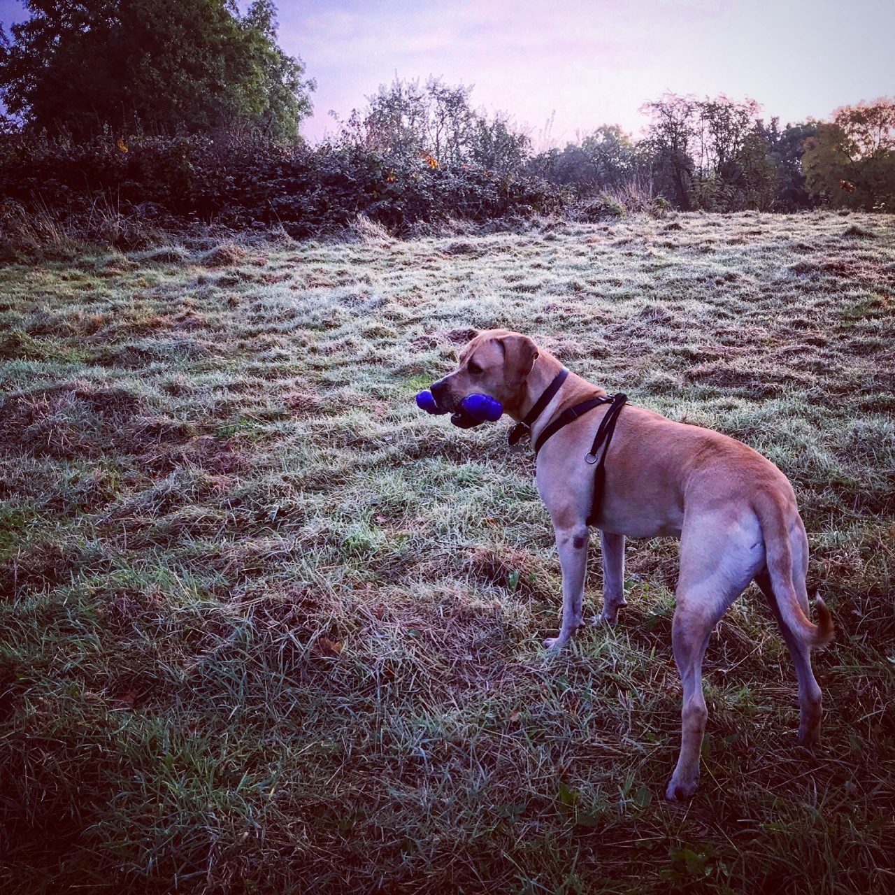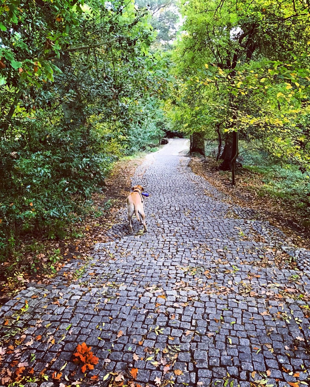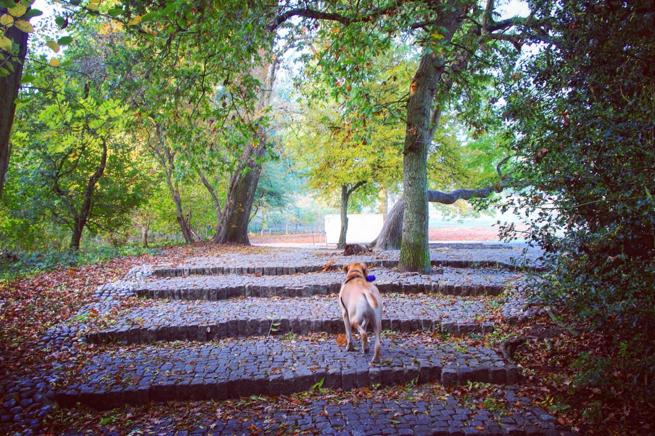 We turned left and cut across the field keeping the hedgerow on our left hand side. Suddenly, also on our left, the Magna Carta Memorial came into view through the trees. This marks the site where King John actually sealed the Magna Carta. It was designed by Sir Edward Maufe and was erected by The American Bar Association in 1957, and it sits on a perfectly gently sloping lawn, surrounded by beautiful ancient trees. It really is such a peaceful spot, that we spent a little bit of time here listening to the breeze moving quietly through the leaves on the branches. Until Hoover spotted a rabbit and took off like a missile in the direction of the hedgerow that is! Needless to say the rabbit outran Hooves without even working up a sweat….perhaps if be bothered to put his purple bone down he might have stood more of a chance of getting near it!