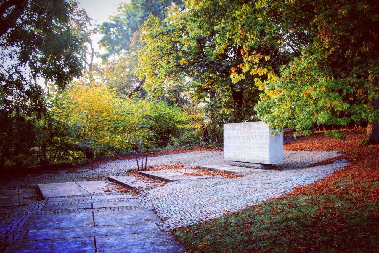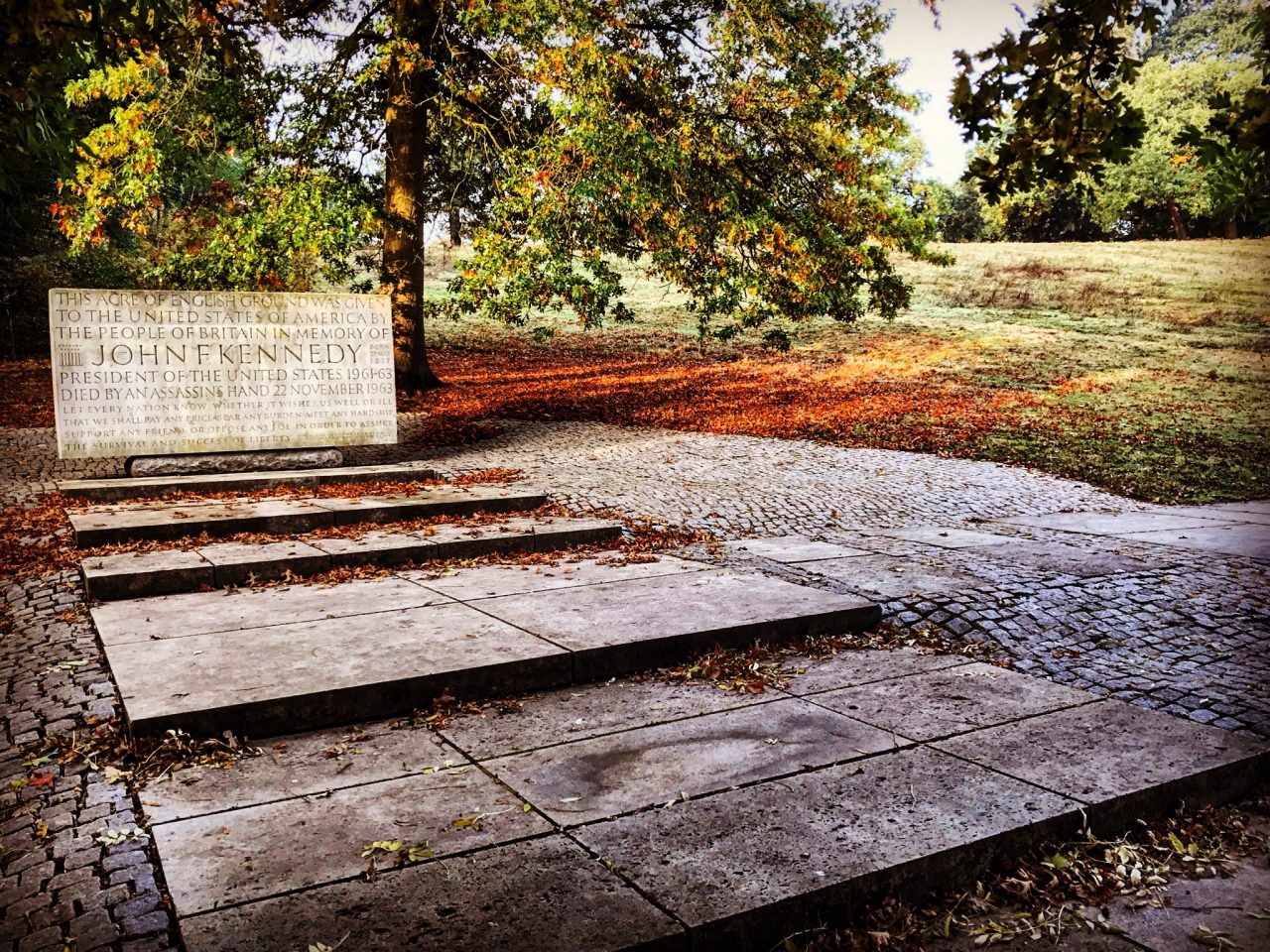 We wandered back out into the water meadow and carried on in the same direction as before. Up ahead we could see the twin memorial lodges and pier designed by Edward Lutyens standing either side of the road. A few minutes after leaving the Magna Carta Memorial we came across the Kennedy Memorial, again on the left. This is the British memorial for John F. Kennedy and it was jointly dedicated on the 14th May 1965 by The Queen and Jacqueline Kennedy. It was listed in 1998. Designed by Geoffey Jellicoe the memorial is made up of three elements: firstly you walk up a stepped pathway, made up of 60,000 granite setts, that winds up through the woodland to a glade. Here you will see the seven ton block of Portland stone, which stands on a plinth and is inscribed with words taken from President Kennedy’s inaugural address in 1961. Off to the right is a wide paved pathway that leads to the Seats of Contemplation from where there is a superb view of Runnymede and the River Thames below. This is another beautifully peaceful spot…